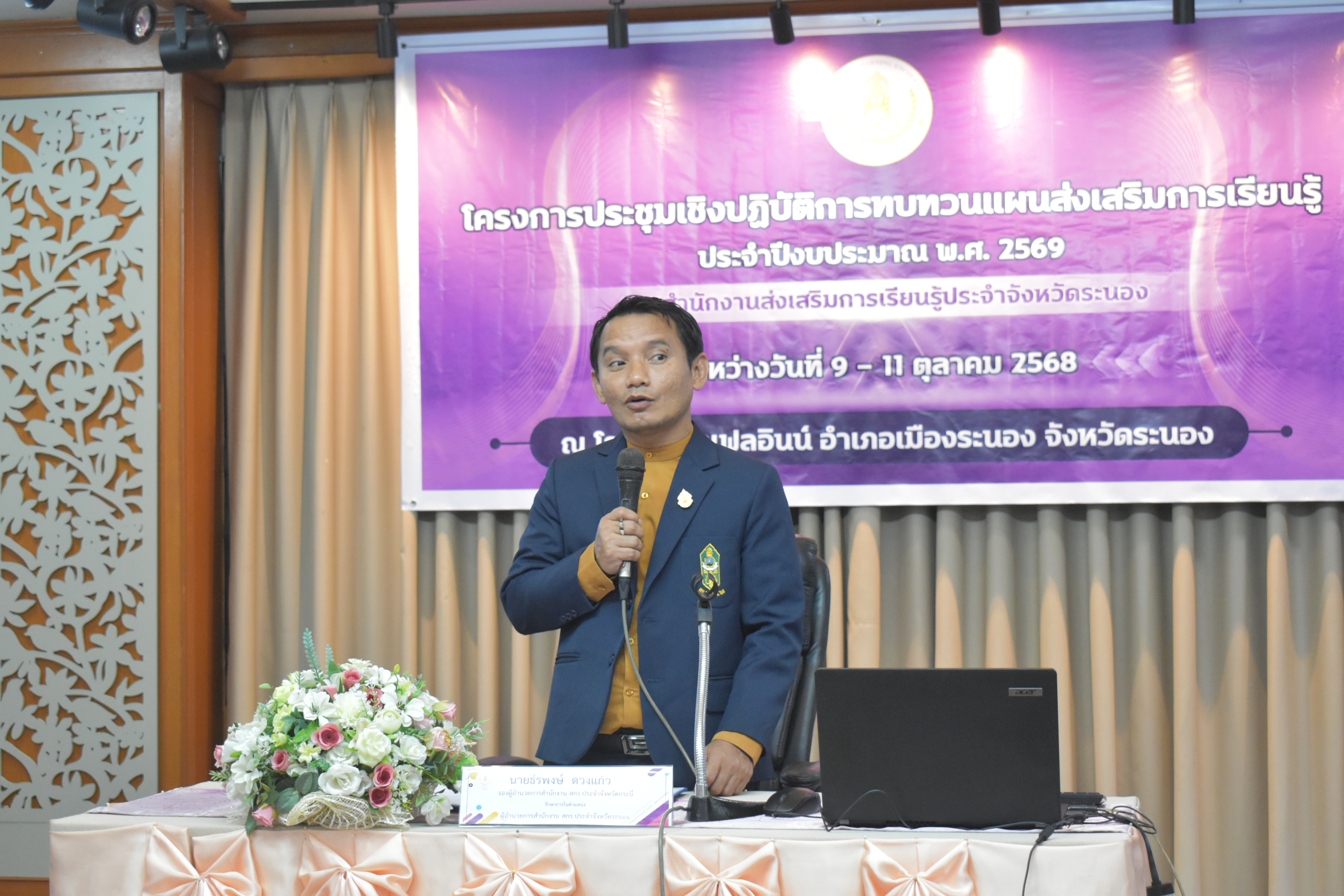 วันที่ 9 ตุลาคม 2568 สำนักงานส่งเสริมการเรียนรู้ประจำจังหวัดระนอง จัดโครงการประชุมเชิงปฏิบัติการทบทวนแผนส่งเสริมการเรียนรู้ ประจำปีงบประมาณ พ.ศ. 2569 ระหว่าง วันที่ 9-11 ตุลาคม 2568 ณ โรงแรมไอเฟลอินน์ อำเภอเมืองระนอง จังหวัดระนอง โดยมี นายธีรพงษ์ ดวงแก้ว รองผู้อำนวยการสำนักงาน สกร.ประจำจังหวัดกระบี่ รักษาการในตำแหน่งผู้อำนวยการสำนักงาน สกร.ประจำจังหวัดระนอง เป็นประธานเปิดโครงการ