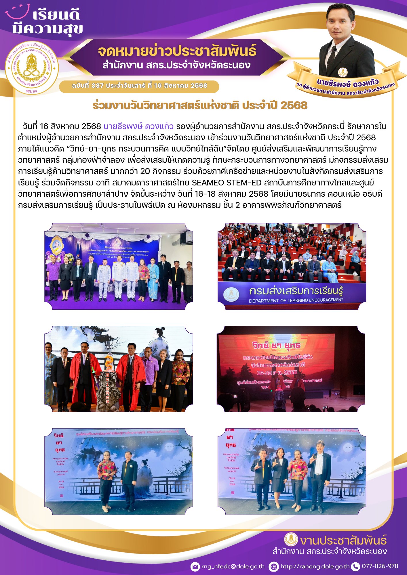 วันที่ 16 สิงหาคม 2568 นายธีรพงษ์ ดวงแก้ว รองผู้อำนวยการสำนักงาน สกร.ประจำจังหวัดกระบี่ รักษาการในตำแหน่งผู้อำนวยการสำนักงาน สกร.ประจำจังหวัดระนอง เข้าร่วมงานวันวิทยาศาสตร์แห่งชาติ ประจำปี 2568 ภายใต้แนวคิด “วิทย์-ยา-ยุทธ กระบวนการคิด แบบวิทย์ใกล้ฉัน”จัดโดย ศูนย์ส่งเสริมและพัฒนาการเรียนรู้ทางวิทยาศาสตร์ กลุ่มท้องฟ้าจำลอง