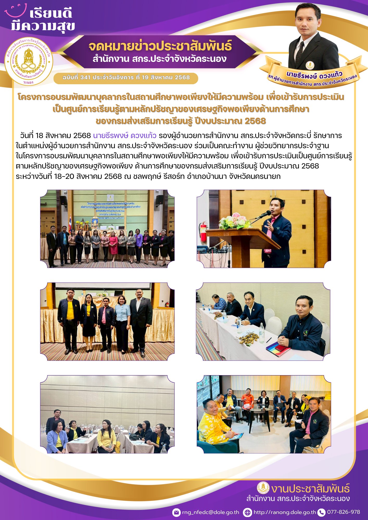 วันที่ 18 สิงหาคม 2568 นายธีรพงษ์ ดวงแก้ว รองผู้อำนวยการสำนักงาน สกร.ประจำจังหวัดกระบี่ รักษาการในตำแหน่งผู้อำนวยการสำนักงาน สกร.ประจำจังหวัดระนอง ร่วมเป็นคณะทำงาน ผู้ช่วยวิทยากรประจำฐานในโครงการอบรมพัฒนาบุคลากรในสถานศึกษาพอเพียงให้มีความพร้อม เพื่อเข้ารับการประเมินเป็นศูนย์การเรียนรู้ตามหลักปรัชญาของเศรษฐกิจพอเพียง ด้านการศึกษาของกรมส่งเสริมการเรียนรู้ ปีงบประมาณ 2568 ระหว่างวันที่ 18-20 สิงหาคม 2568 ณ ชลพฤกษ์ รีสอร์ท อำเภอบ้านนา จังหวัดนครนายก