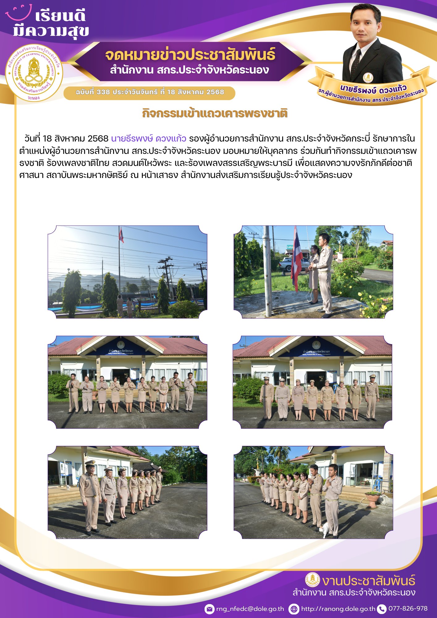 วันที่ 18 สิงหาคม 2568 นายธีรพงษ์ ดวงแก้ว รองผู้อำนวยการสำนักงาน สกร.ประจำจังหวัดกระบี่ รักษาการในตำแหน่งผู้อำนวยการสำนักงาน สกร.ประจำจังหวัดระนอง มอบหมายให้บุคลากร ร่วมกันทำกิจกรรมเข้าแถวเคารพธงชาติ ร้องเพลงชาติไทย สวดมนต์ไหว้พระ และร้องเพลงสรรเสริญพระบารมี เพื่อแสดงความจงรักภักดีต่อชาติ ศาสนา สถาบันพระมหากษัตริย์ ณ สำนักงานส่งเสริมการเรียนรู้ประจำจังหวัดระนอง